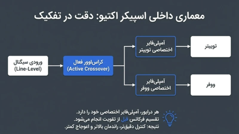 اینجا یک نکته ظریف وجود دارد که خیلیها نادیده میگیرند. هر اسپیکر Active یک اسپیکر Powered است، اما هر Powered لزوماً Active واقعی نیست. در بعضی مدلهای ارزانتر که با عنوان Powered فروخته میشوند:
